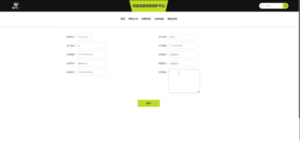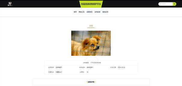 动物信息:动物信息模块展示校园内流浪动物的详细信息,包括品种、年龄、健康状况、救助进展等,方便用户了解并选择领养合适的动物。