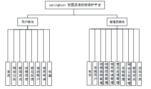按照校园流浪动物保护平台的角色,我划分为用户模块和管理员模块等功能。