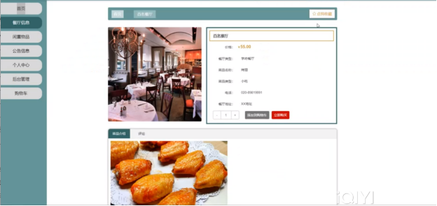 (4)餐厅信息:点击“餐厅信息”这个菜单,可以查看到系统中所有添加的餐厅信息,支持通过关键词进行查询,如果想要了解某一餐厅信息的详细信息,点击后面的“详情”会进入详情查看界面,可以对餐厅信息进行添加购物车、购买、收藏、评论等操作;