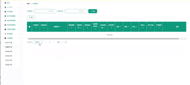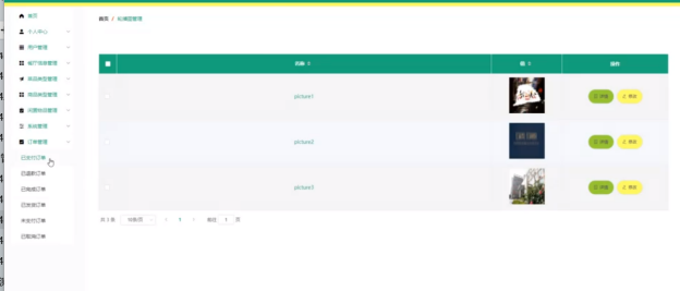 (2)订单管理:进入后台首页工具栏点击“订单管理”这个按钮可以查看所有已支付订单、已退订单、已完成订单、已发货订单、未支付订单、要取消订单等信息,可以进行详情查看、删除、查看评论等操作。