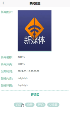 (3)新闻信息:当用户点击下方导航栏“新闻信息”这一菜单按钮,会显示管理员在后台发布的所有的新闻信息,可以查看详情,进行记录、收藏、点赞、评论等。