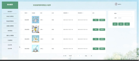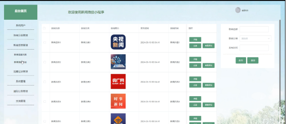 Driven by the wave of digitization, we have kept up with the times, leveraging the powerful backend development capabilities of Spring Boot and the flexibility of Vue.js front-end framework, combined with the extensive user base of WeChat mini programs, and carefully crafted a novel news WeChat mini program. This mini program not only provides real-time and convenient news and information services, but also brings users an immersive news reading experience through its user-friendly interface and rich social functions. Whether it's quick browsing of news highlights or deep participation in news discussions, users can easily achieve it in our news mini program, making news acquisition simpler, more efficient, and more interesting. This system is developed using Java language and JavaEE technology based on MVC pattern. It is written using MyEclipse compiler and mainly uses Microsoft's MySQL relational database as the data storage medium. The system is developed in conjunction with front-end HTML+CSS technology.