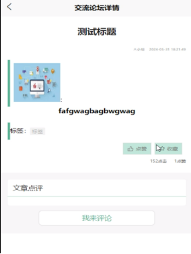 (2)交流论坛:当用户点击下方导航栏“交流论坛”这一菜单按钮,会显示管理员在后台发布的所有的交流论坛,可以查看详情,进行收藏、点赞、评论等。
