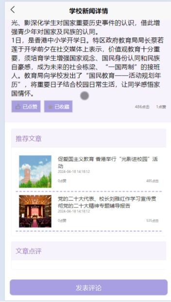 学校资讯:当用户点击下方导航栏“学校资讯”这一菜单按钮,会显示管理员在后台发布的所有的学校资讯,可以查看详情,进行添加点赞、收藏、评论等。界面如下图所示。