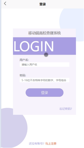 (1)登录:移动端高校查寝系统小程序前台注册后的用户是可以通过自己的账户名和密码进行登录的,当用户输入完整的自己的账户名和密码后,点击“登录”按钮后,将会首先验证输入的有没有空数据,再次验证输入的账户名+密码和数据库中当前保存的用户信息是否一致,只有在一致后将会登录成功并自动跳转到移动端高校查寝系统小程序的首页中;否则将会提示相应错误信息。
