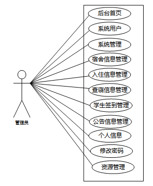 系统用例分析是对移动端高校查寝系统小程序中各个功能模块的用户需求和行为进行分析,以识别和描述不同的用户用例。通过系统用例分析,可以深入了解用户在平台上的操作流程,为系统设计和开发提供指导,并确保平台能够满足用户的需求和期望。