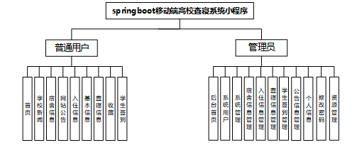 移动端高校查寝系统小程序划分为了用户管理模块和管理员模块这两大部分。