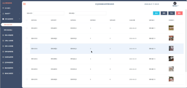 点击左侧菜单“饲料信息管理”,页面跳转到饲料信息管理外观,调用后台查询所有饲料信息。并将信息密封到数据集合List,绑定到请求对象,然后页面跳转到相应的Java页面,显示出饲料信息,单击删除按钮完成饲料信息的删除。