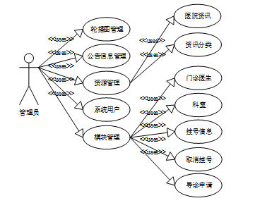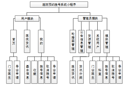 医院预约挂号小程序在对需求做解析后,整个系统主要分为两个部分:管理员和用户,每个模块下的分支功能不一样。对功能做出如下说明: