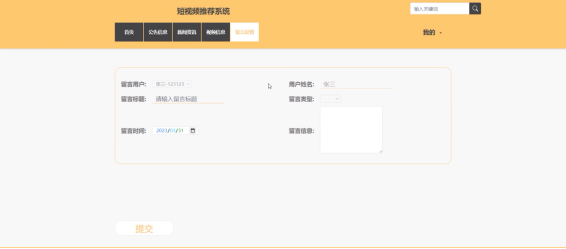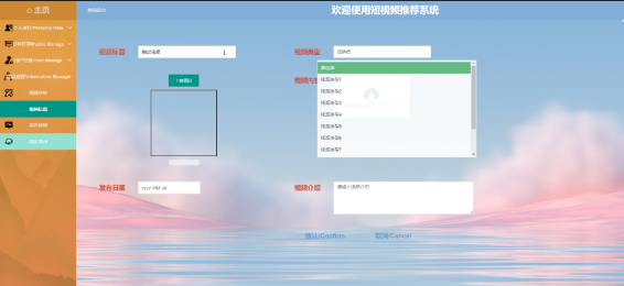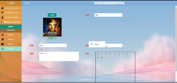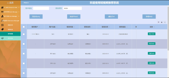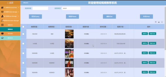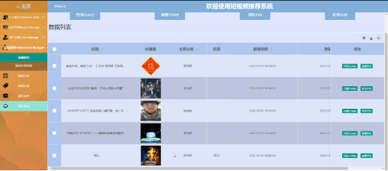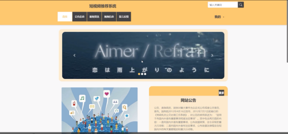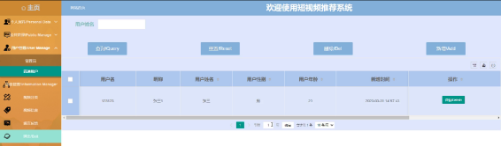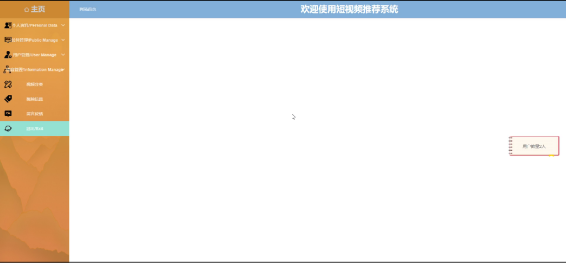 The system adopts a B/S structure, adopting a browser interactive mode for all business modules, selecting MySQL as the system database, and using SpringBoot as the development tool for system design. The main functional modules of the short video recommendation system have been basically implemented. This system has two main functional modules: administrator and user. The administrator includes the homepage, personal information, public management (such as broadcast images and announcement information), user management (such as administrators and ordinary users), information management (such as news information and news classification lists), video classification, video information, and message feedback; Users: Home page, message board, announcement information, news information, video information, message feedback, and other operations.