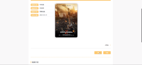 视频信息,在此界面可查看视频标题、类型、内容、介绍、视频封面、发布日期等信息,还可在此页面进行详情,查看评论,重置,删除,添加等操作,如下图所示:
