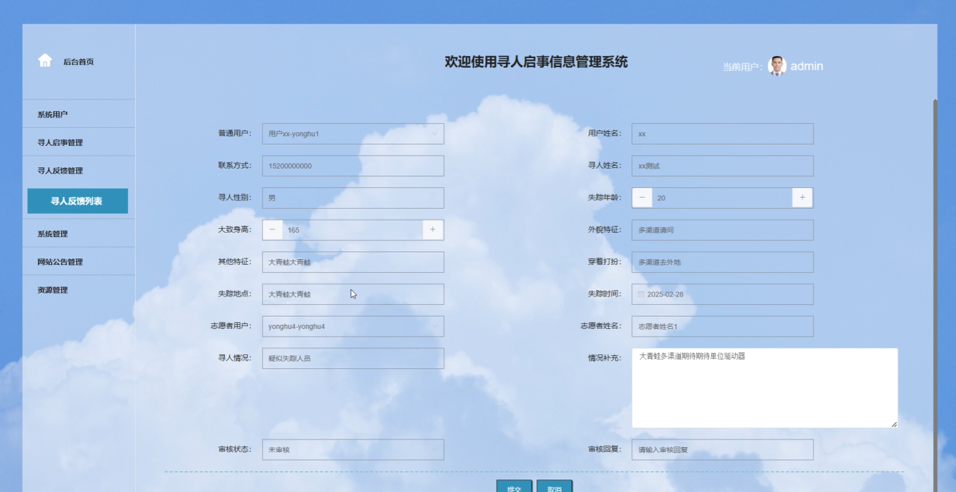 寻人反馈管理:审核和处理用户提交的寻人反馈信息,确保反馈内容的真实性和有效性。支持标记反馈为已处理状态。