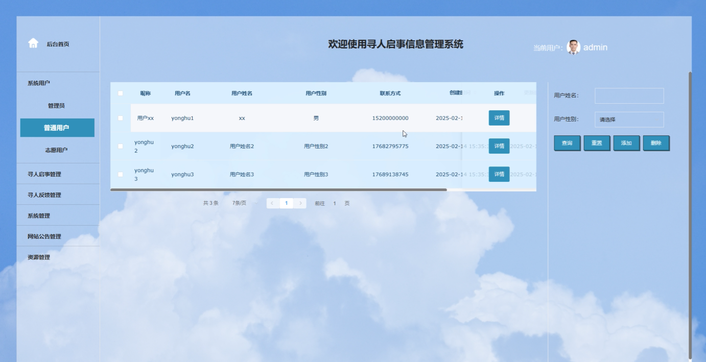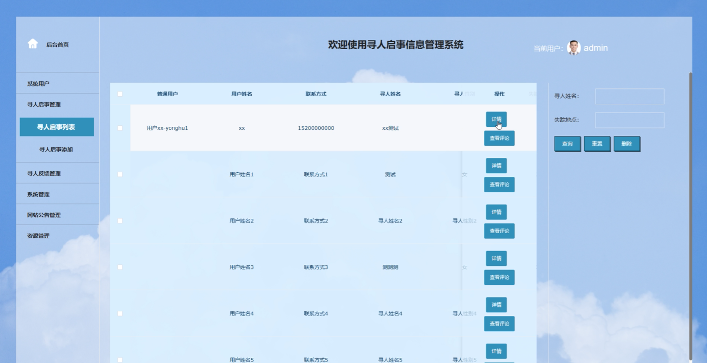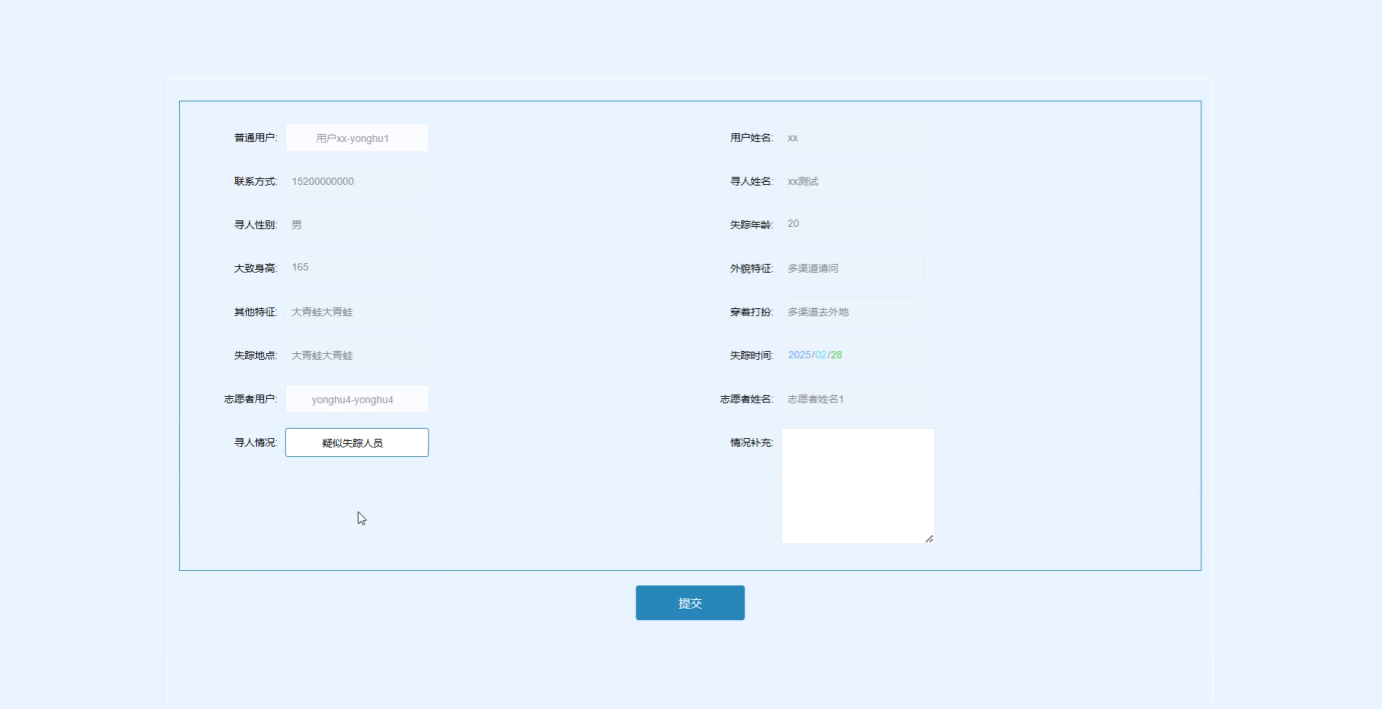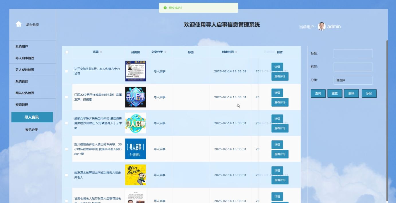 随着社会的发展,失踪人口问题日益受到关注,传统的寻人方式效率低下且覆盖范围有限。为解决这一问题,本研究旨在设计并实现一个寻人启事信息管理系统。系统通过整合现代信息技术,提供高效、便捷的寻人服务平台,满足普通用户、志愿用户及管理员的不同需求,从而提升寻人效率和社会协作能力。系统主要实现了寻人启事发布与管理、用户互动反馈、资讯浏览等功能模块。采用Spring Boot作为后端框架,结合Java语言开发核心逻辑,并使用MySQL数据库存储用户数据和寻人信息。系统支持普通用户的点赞、收藏、评论操作,志愿用户的反馈提交,以及管理员的后台管理功能。