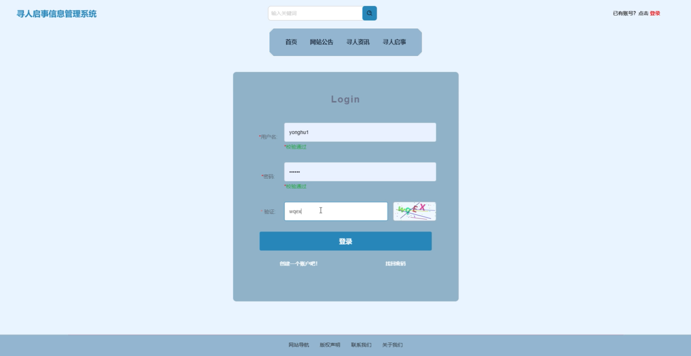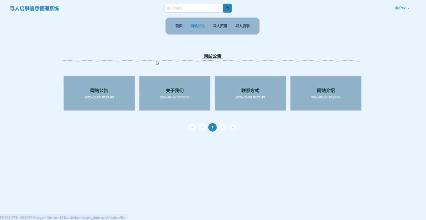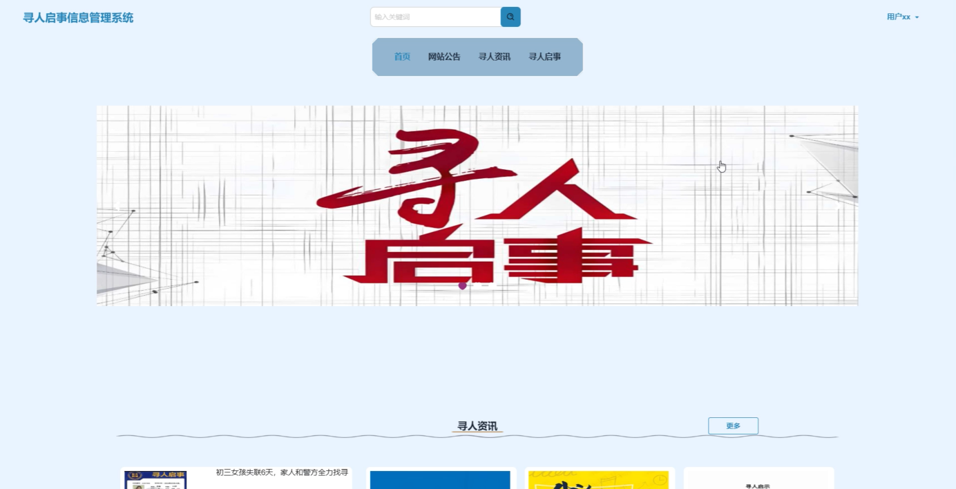 首页:展示最新的寻人启事、网站公告和轮播图内容,方便用户快速获取重要信息。支持按条件筛选和搜索功能,帮助用户精准定位目标信息。