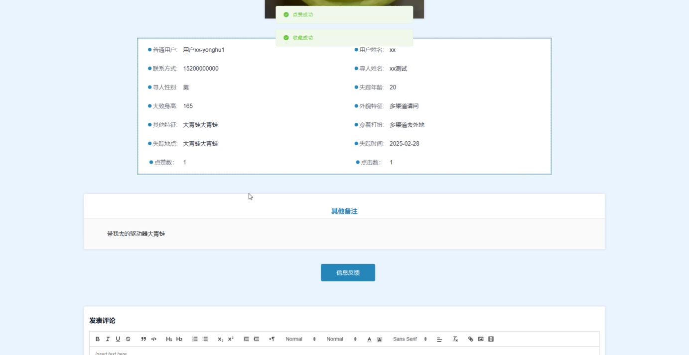 寻人启事:浏览所有发布的寻人启事信息,查看详细内容并进行点赞、收藏和评论操作。支持按照条件筛选和排序。
