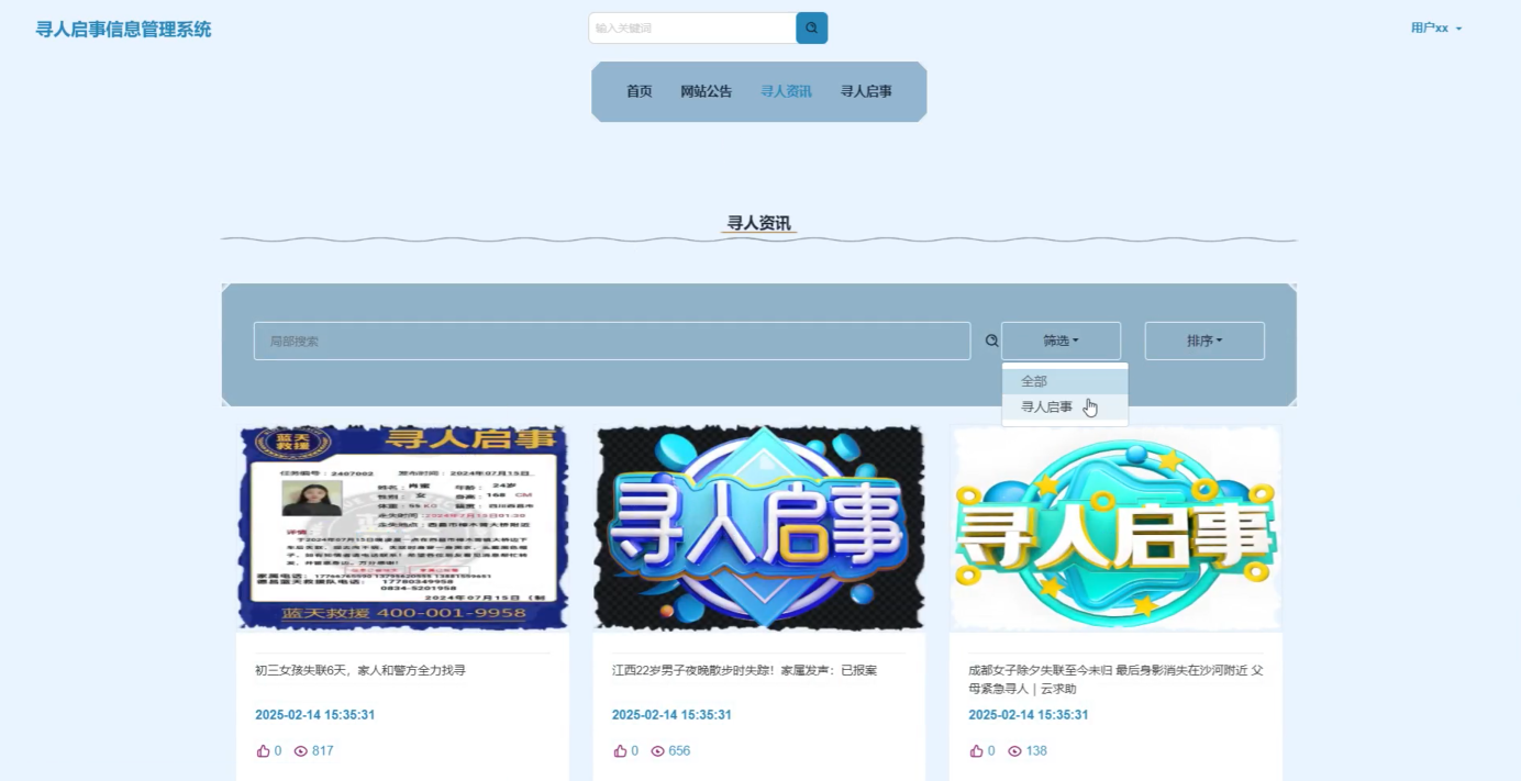 寻人启事:浏览所有发布的寻人启事信息,查看详细内容并进行点赞、收藏和评论操作。支持按照发布时间、失踪地点等条件排序和筛选。