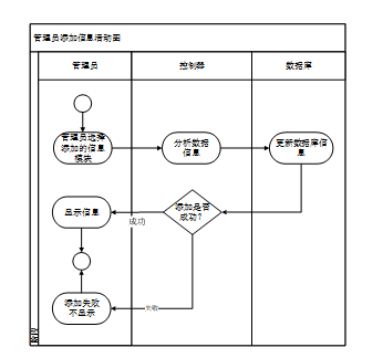 此活动图描述了管理员添加信息。管理员可以通过信息管理模块页面选择要添加的基本信息。添加成功传入数据库中,失败则不添加。管理员可以保存信息并更新系统中的信息。管理员添加信息功能的活动图如图3-5所示。