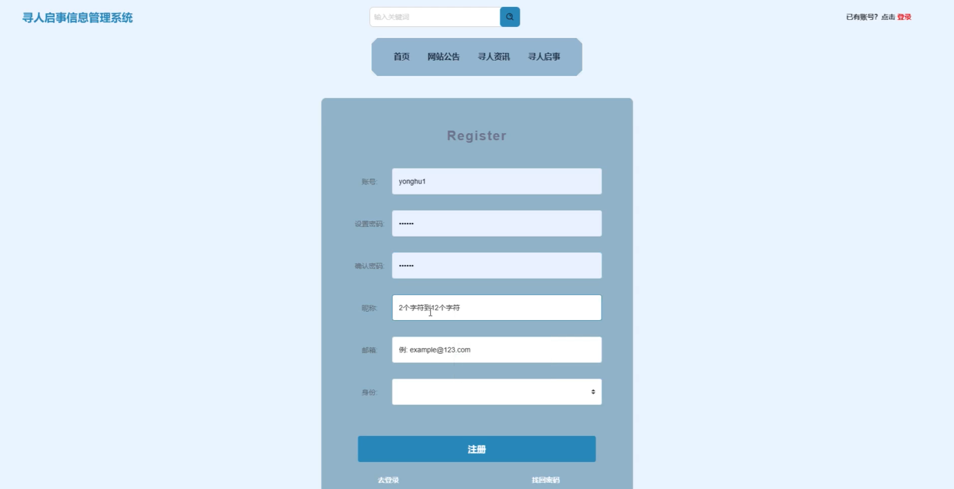 本研究旨在设计并实现一个基于Spring Boot、Java和MySQL的寻人启事信息管理系统,以解决传统寻人方式效率低下、覆盖范围有限的问题。通过整合现代信息技术,系统致力于为普通用户、志愿用户及管理员提供高效、便捷的信息发布与管理平台,提升寻人信息的传播效率和社会协作能力,同时优化用户体验并确保数据安全。