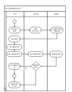 用户注册登录,系统从数据库获取用户数据信息,登录成功用户进入查询页面,用户输入查询关键字,数据库查询用户所输入的关键字,查询成功显示查询的模块信息,查询失败不显示。用户登录查询功能的活动图如图3-4所示。