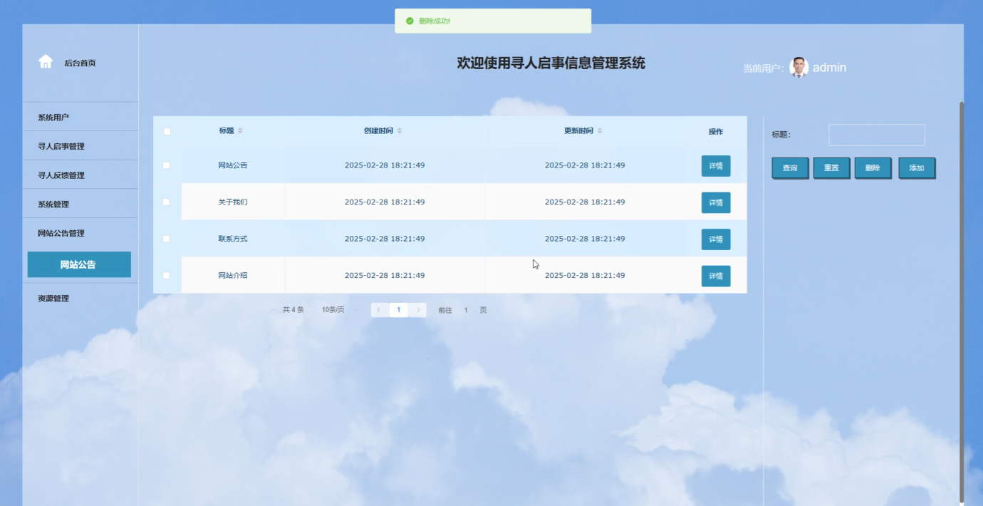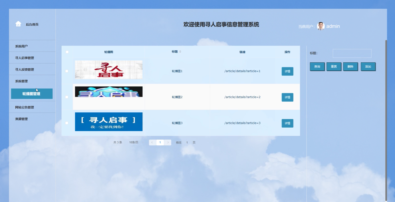 首页:与普通用户相同,展示最新的寻人启事、网站公告和轮播图内容。支持筛选和搜索功能以快速定位目标信息。