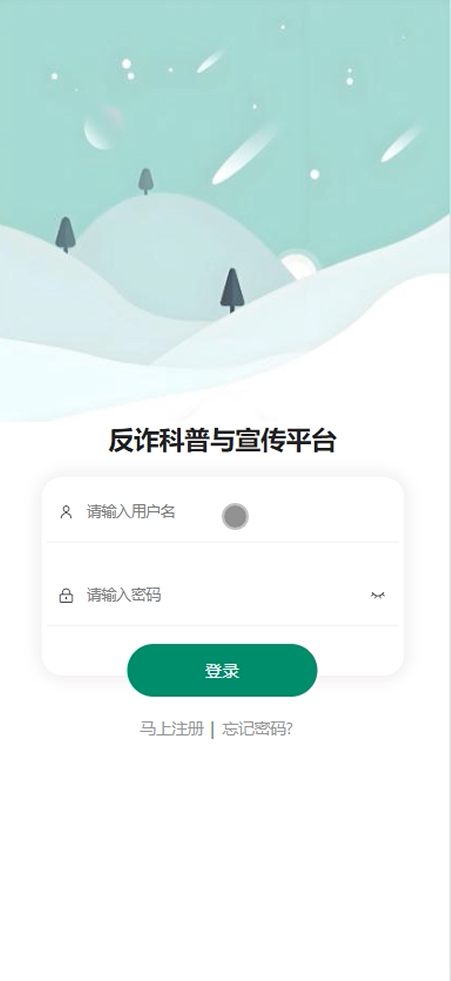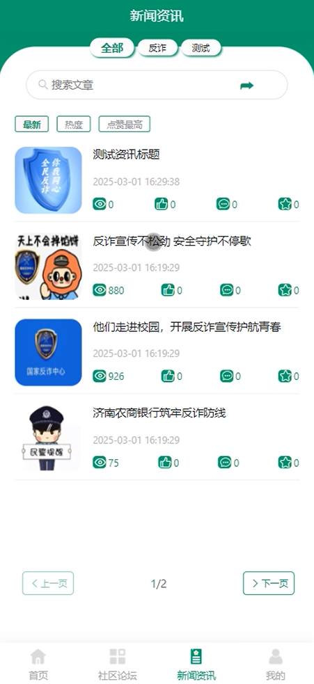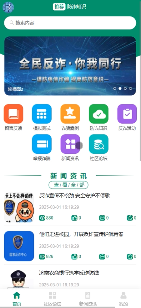 首页:展示留言反馈、模拟测试、诈骗案例、防诈知识、反诈活动、举报诈骗、新闻资讯、社区论坛等内容,为用户提供全面的信息入口。用户可以通过搜索或浏览快速找到所需信息。