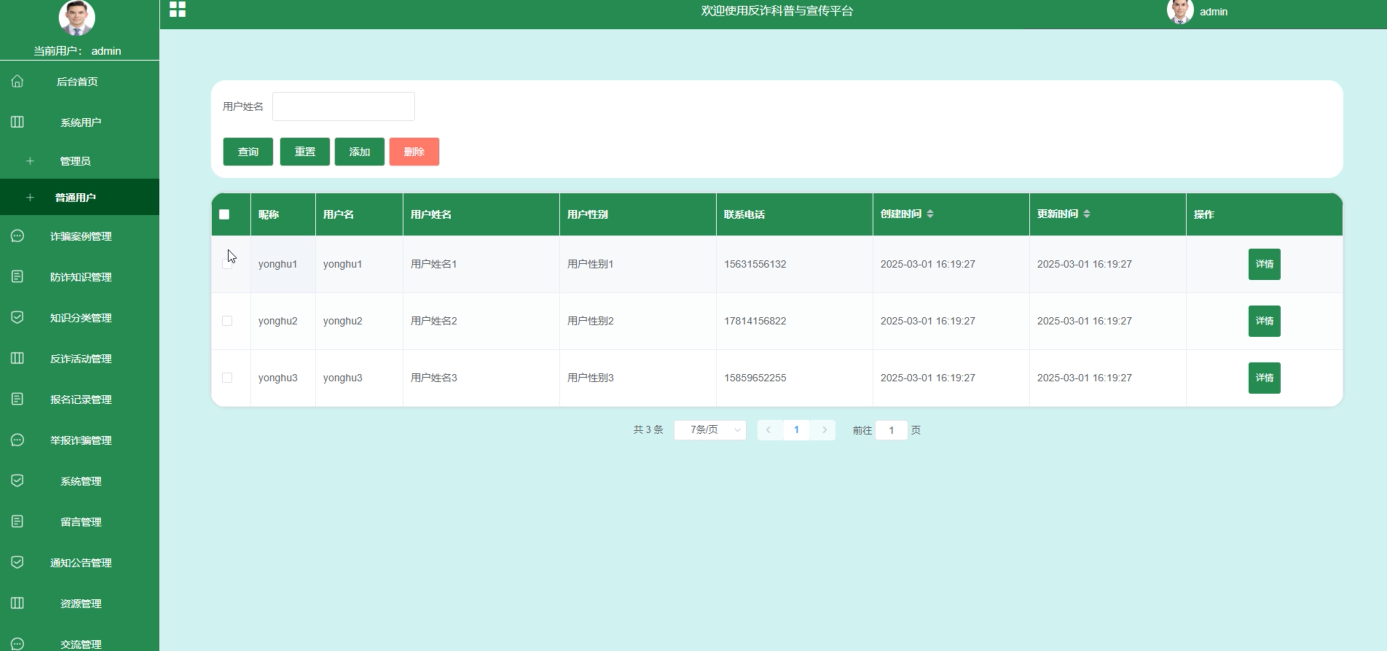 后台首页:提供诈骗案例和防诈知识的统计数据,帮助管理员了解整体情况并做出决策。