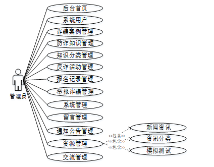 系统用例分析是对反诈科普与宣传平台中各个功能模块的用户需求和行为进行分析,以识别和描述不同的用户用例。通过系统用例分析,可以深入了解用户在系统上的操作流程和交互方式,为系统设计和开发提供指导,并确保系统能够满足用户的需求和期望。