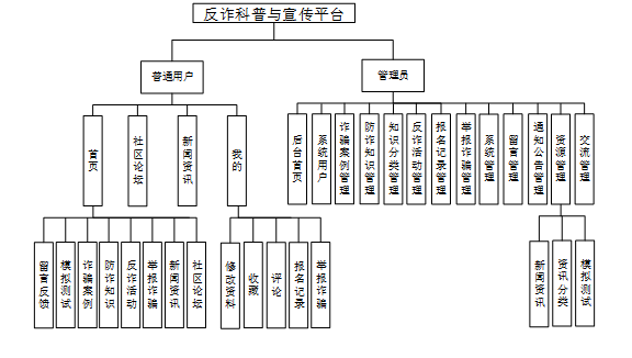 本系统旨在通过微信小程序为用户提供一个全面的反诈科普与宣传平台,同时为管理员提供有效的后台管理工具。系统设计注重用户体验,提供了包括首页资讯展示、模拟测试、诈骗案例分享、防诈知识学习、反诈活动参与等功能模块,并针对管理员设置了内容审核、用户管理、统计分析等服务,确保信息传播的有效性和安全性。具体功能描述如下: