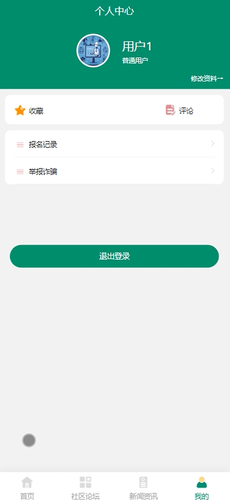 我的:允许用户修改个人信息,查看收藏、评论、报名记录、举报诈骗等,实现个性化的用户体验。