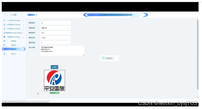 自助旅游管理系统的主要使用者分为管理员,管理者用户和普通用户,实现功能包括:主页,个人资料,公共管理(轮播图,在线公告),用户管理(管理员,普通用户,管理者用户),信息管理(在线留言,留言分类,旅游资讯,资讯分类),权限管理(权限列表),旅游基地,路线规划,周边服务等功能。可以提高旅游规划效率。