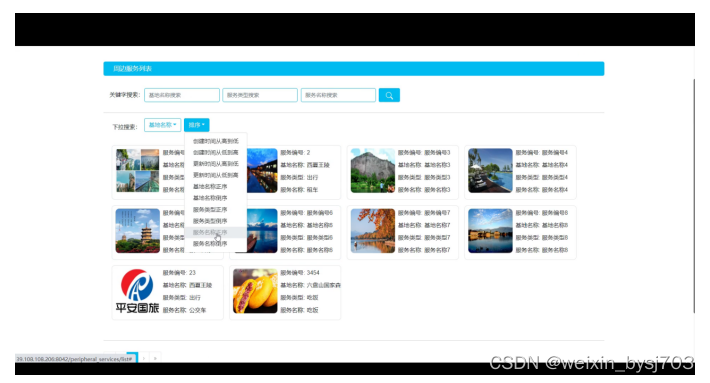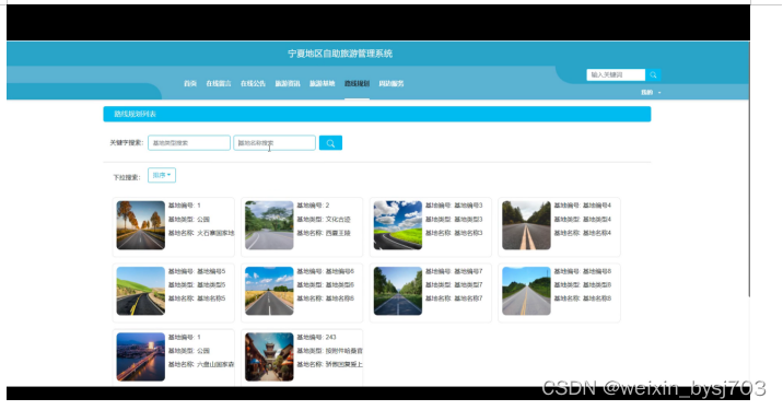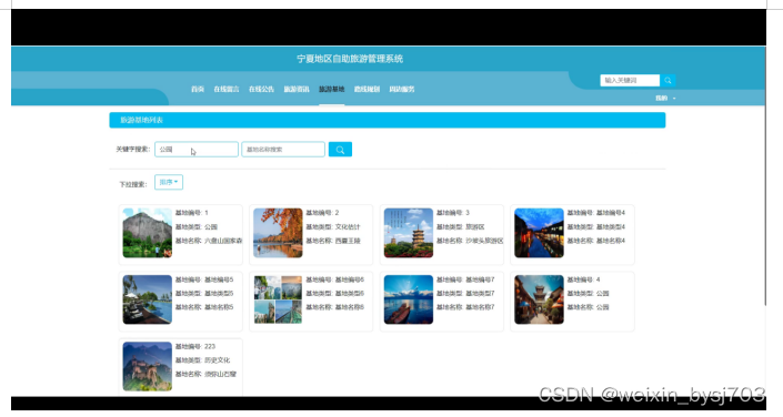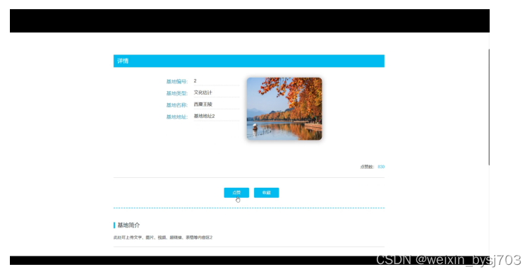 旅游基地,用户在此页面可以通过搜索,排序等方式查看旅游基地的相关信息,可以进行收藏,点赞,评论等操作,如下图所示。