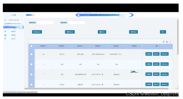 旅游基地,管理员在此页面可以维护管理旅游基地的相关信息,还可以通过导入文档或者手动添加路线,查看评论等,如下图所示。