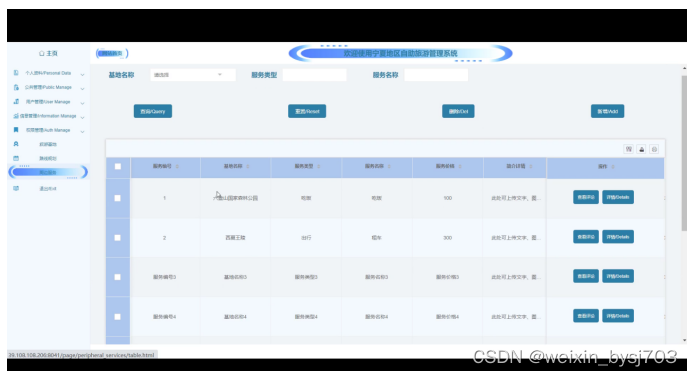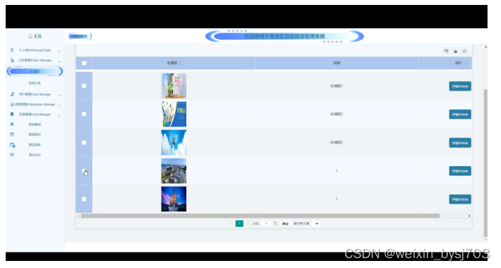 (1)功能要求:可以管理主页,个人资料,公共管理(轮播图,在线公告),用户管理(管理员,普通用户,管理者用户),信息管理(在线留言,留言分类,旅游资讯,资讯分类),权限管理(权限列表),旅游基地,路线规划,周边服务等功能模块。