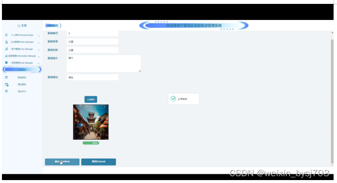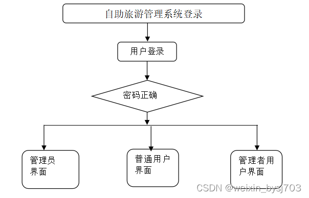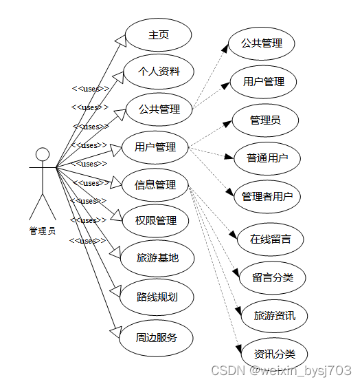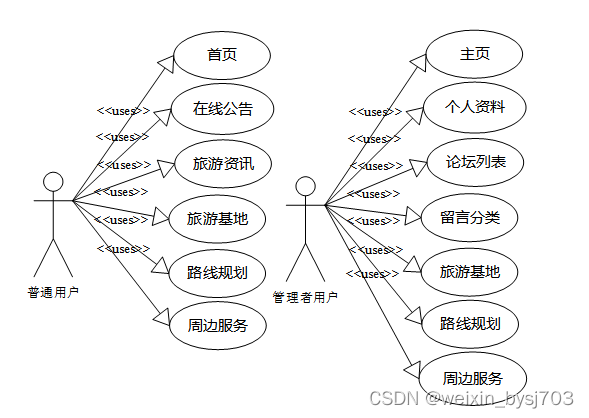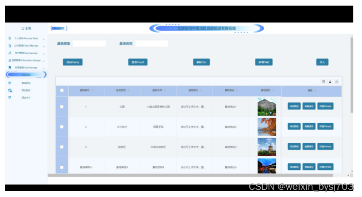 The main users of the self-service tourism management system are divided into administrators, manager users, and ordinary users. The functions include: homepage, personal information, public management (broadcast maps, online announcements), user management (administrators, ordinary users, manager users), information management (online messages, message classification, tourism information, information classification), permission management (permission list), tourism base, and route planning, Peripheral services and other functions. It can improve the efficiency of tourism planning.