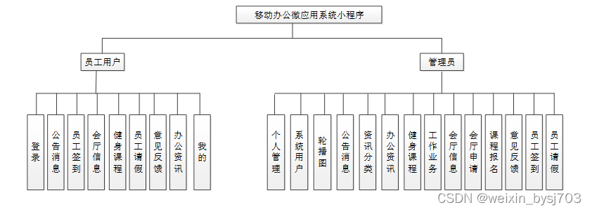 按照移动办公微应用系统小程序的角色,我划分为了员工用户管理模块和管理员管理模块这两大部分。