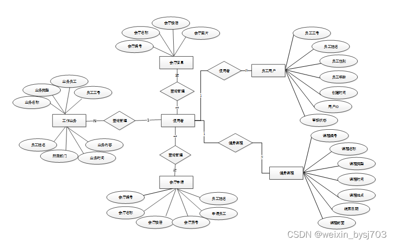 下面是整个移动办公微应用系统小程序中主要的数据库表总E-R实体关系图。