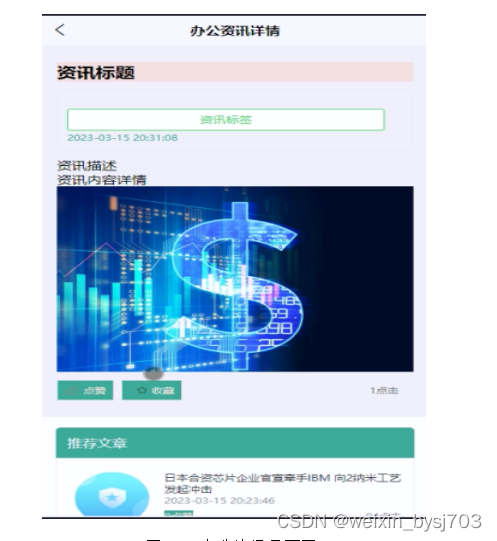 (4)办公资讯:当用户点击“办公资讯”这一菜单按钮,会显示管理员在后台发布的所有的办公资讯,可以查看详情,进行收藏、点赞、评论等;