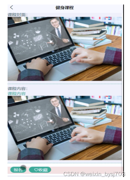 (7)健身课程:员工可以查看健身课程,在查询到自己想要了解的健身课程的时候,可以进入查看详细的介绍,点击“报名”这一按钮以后会跳转到报名信息填写的界面,根据提示填写好报名的信息,点击“提交”以后报名就完成了;在健身课程详情这个界面,同时支持用户对喜欢的健身课程进行收藏的功能。