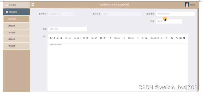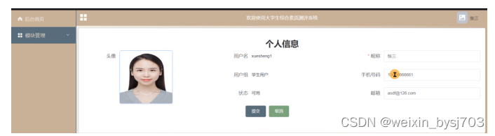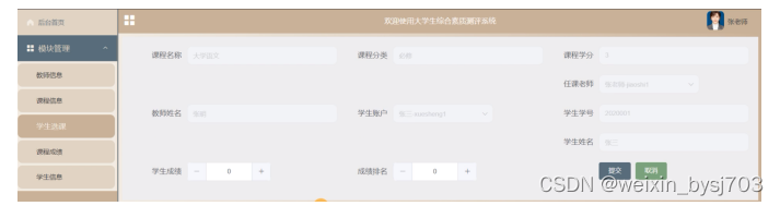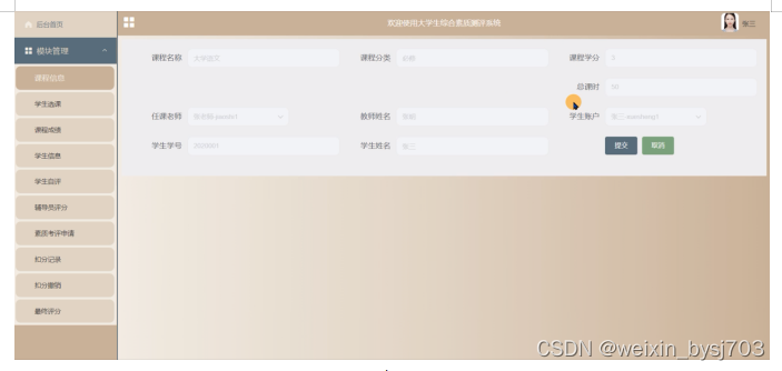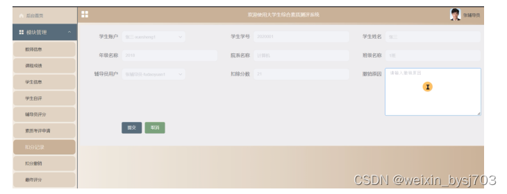3、功能的完善性:拥有后台首页,系统用户(管理员、学生用户、教师用户、辅导员)权限管理、模块管理(年级名称、班级名称、院系名称、教师信息、课程信息、学生选课、课程成绩、学生信息、学生自评、辅导员评分、素质考评申请、扣分记录)个人信息等功能的修改维护操作。