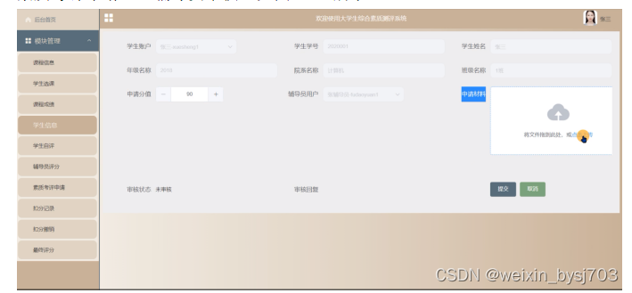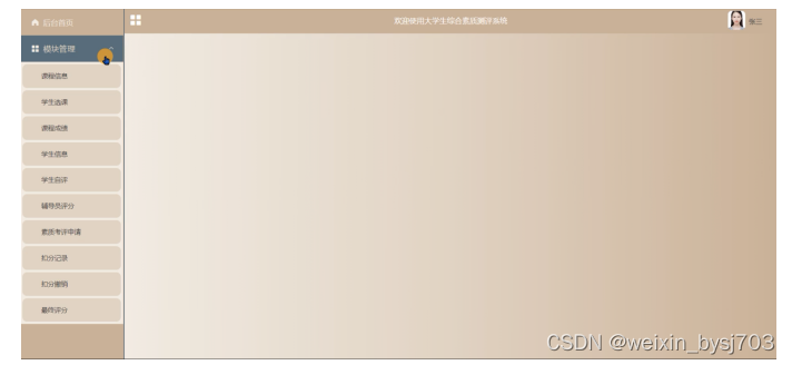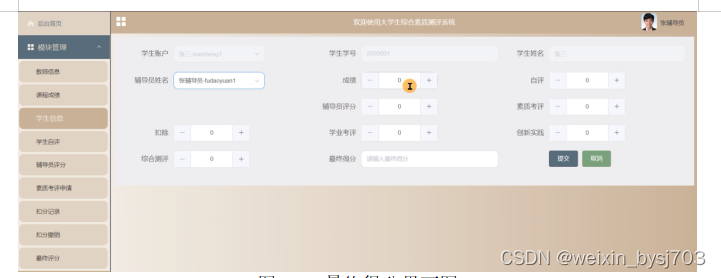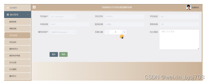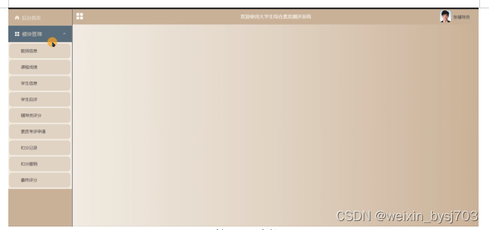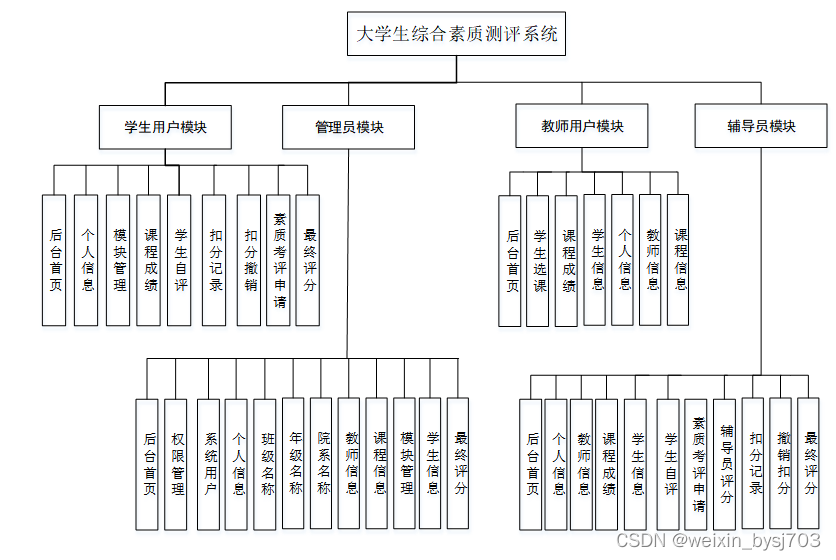 (1)功能要求:后台首页,系统用户(管理员、学生用户、教师用户、辅导员)权限管理、模块管理(年级名称、班级名称、院系名称、教师信息、课程信息、学生选课、课程成绩、学生信息、学生自评、辅导员评分、素质考评申请、扣分记录)个人信息等功能模块。