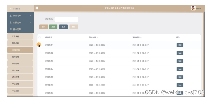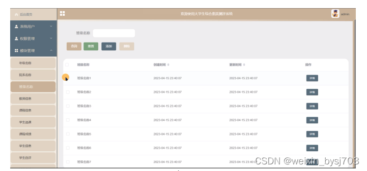 班级名称:管理员在此页面可以添加班级名称进行管理,可根据里进行详情、删除、查询等操作,如图5-5所示。