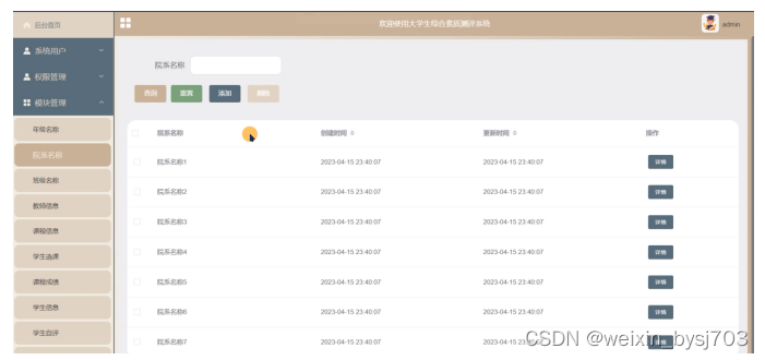 院系名称:管理员在此页面可以添加院系名称进行管理,可根据里进行详情、删除、查询等操作,如图5-6所示。