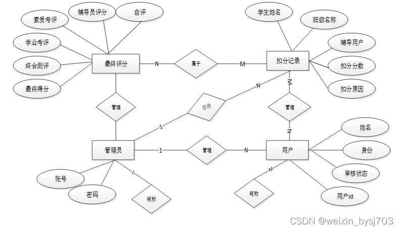 通过大学生综合素质测评系统的功能进行规划分成几个实体信息,实体信息将通过ER图进行说明,本系统的主要实体图如下: