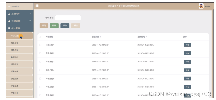 年级名称:管理员在此页面可以添加年级名称进行管理,可根据里进行详情、删除、查询等操作,如图5-6所示。