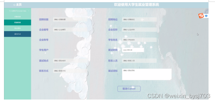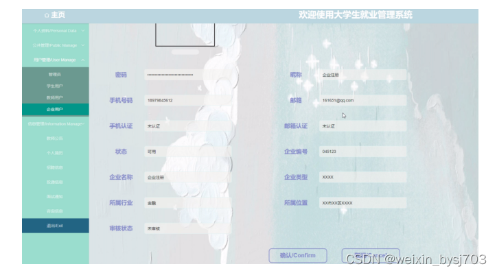 大学生就业管理系统主要功能模块包括系统首页、个人资料、公共管理(轮播图、公告栏)用户管理 (管理员、学生用户、教师用户、企业用户)信息管理(招聘资讯、资讯分类、教师公告、个人简历、招聘信息、投递信息、面试通知、咨询信息)管理,采取面对对象的开发模式进行软件的开发和硬体的架设,能很好的满足实际使用的需求,完善了对应的软体架设以及程序编码的工作,采取Mysql作为后台数据的主要存储单元,采用springboot框架、ava技术、Ajax技术进行业务系统的编码及其开发,实现了本系统的全部功能。本次报告,首先分析了研究的背景、作用、意义,为研究工作的合理性打下了基础。针对大学生就业管理系统的各项需求以及技术问题进行分析,证明了系统的必要性和技术可行性,然后对设计系统需要使用的技术软件以及设计思想做了基本的介绍,最后来实现大学生就业管理系统和部署运行使用它。