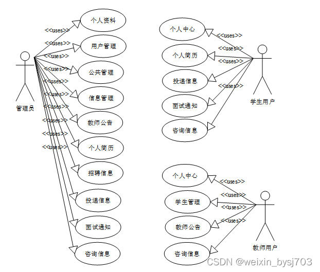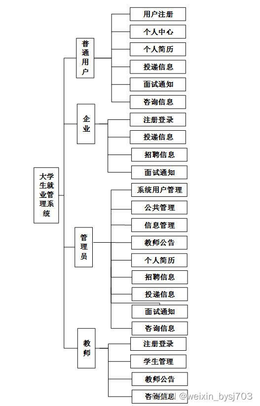 大学生就业管理系统的功能主要分为前台用户根据自己的需求进行注册登录,浏览职位信息并对选中的职位进行申请操作。后台系统管理员因职责的不同,分为普通管理员和超级管理员,普通管理员主要对申请单进行处理,而超级管理员主要对注册用户,新闻数据,职位详细信息,企业详细信息进行处理。