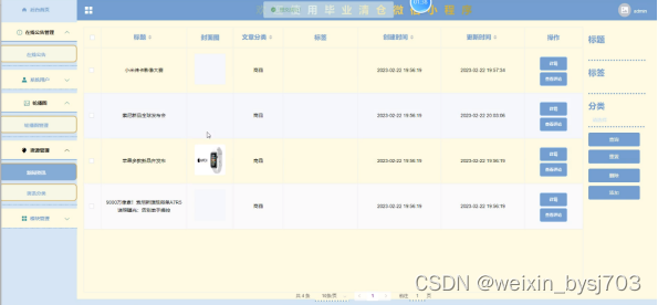 新闻资讯管理,在新闻资讯管理页面中可以查看到标题、封面图、文章分类、头像、标签、描述、等信息进行添加、删除或详细等操作,如图5-10所示。
