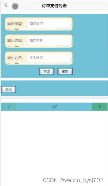 订单支付;列表,在订单支付页面可查看商品类型、商品名称、学生姓名等信息,进行添加、查询、删除如图5-5所示。