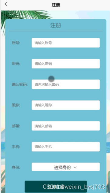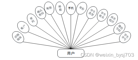 用户注册,在用户注册页面通过填写账户、密码、确认密码、昵称、邮箱、手机、身份、学生姓名、所在校区、联系电话、详细地址、微信号码、学生学号等信息完成用户注册,如图5-2所示。用户在登录页面通过填写用户名、密码、等信息进入系统,如图5-3所示。