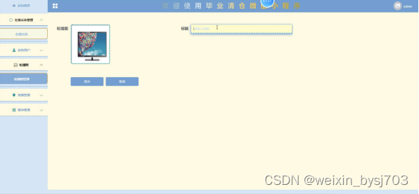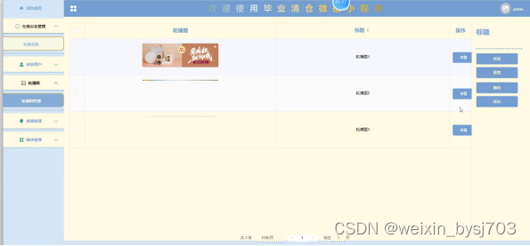 轮播图管理,在轮播图管理页面中可以添加通知信息:轮播图、标题等信息,还可在轮播图管理页面对轮播图信息进行添加、删除或详细等操作,如图5-8所示。